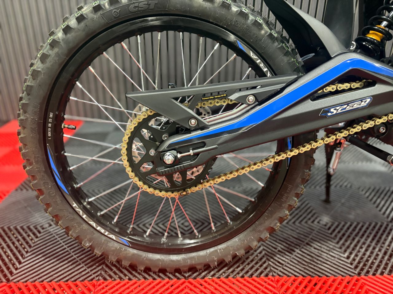However, it’s the Blue accents that truly set this bike apart. Featuring anodised blue hubs, suspension linkage, and striking blue decals against the black frame, this colourway mimics the "spark" of electricity. It signals to onlookers that this isn't a combustion engine bike—it's the future. The blue highlights pop beautifully against the grey asphalt of the city, ensuring you are seen and admired.